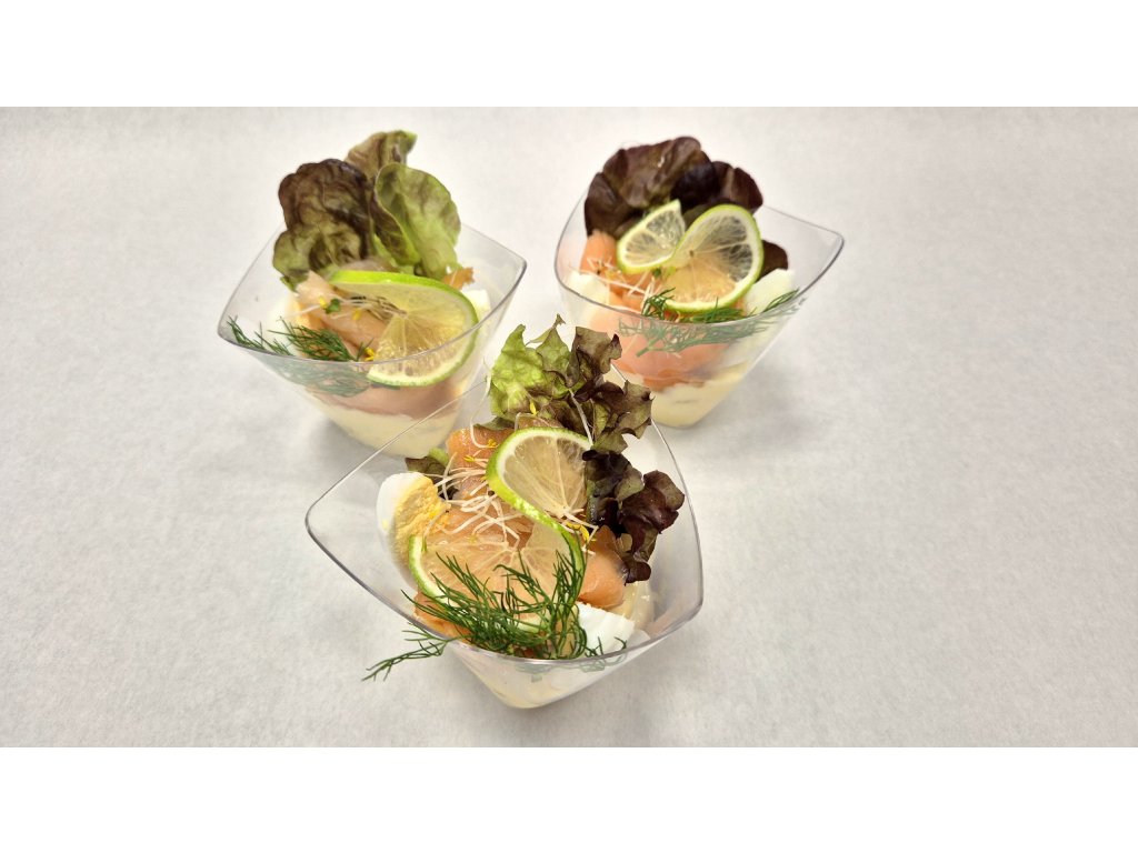 suroviny : vajíčkový šalát, losos, vajíčko, listový šalát, kôpor, limetka