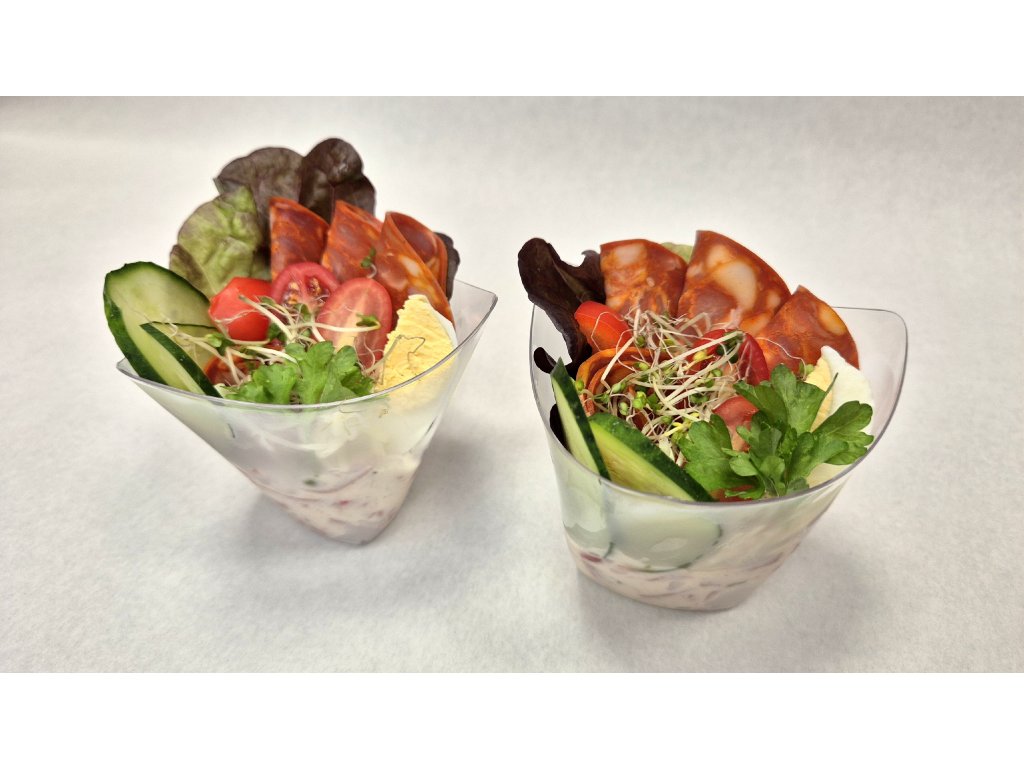 parížsky šalát, chorízo saláma, vajíčko, strúhaný syr, zeleninové zdobenie